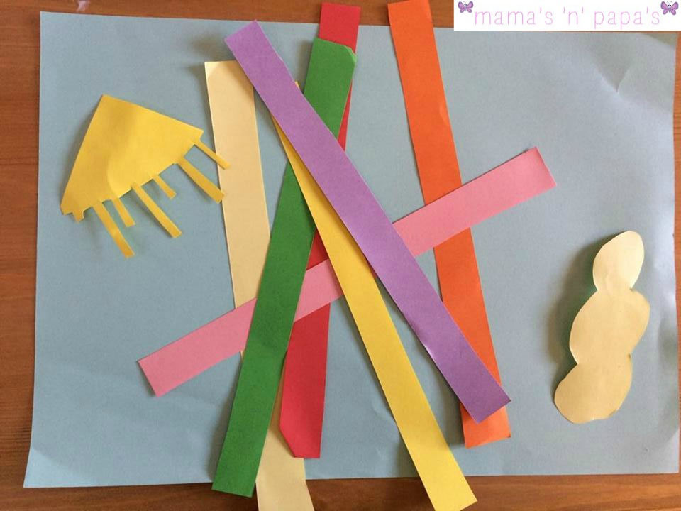 Ψάξαμε να βρούμε όλα τα χρωματιστά χαρτιά μας. Διάλεξε αυτός τα χρώματα που θα είχε και αμέσως πήρε το ψαλίδι στο χέρι του.Φρόντισα να τον βοηθήσω να κόψει μία λωρίδα από κάθε χαρτί που είχε επιλέξει. Τον βοήθησα φτιάχνοντας του την γραμμή που έπρεπε να κόψει. Έπειτα σχεδιάσαμε έναν ήλιο σε κίτρινο χαρτί και δυο τρία συννεφάκια σε απαλό καναρινί!